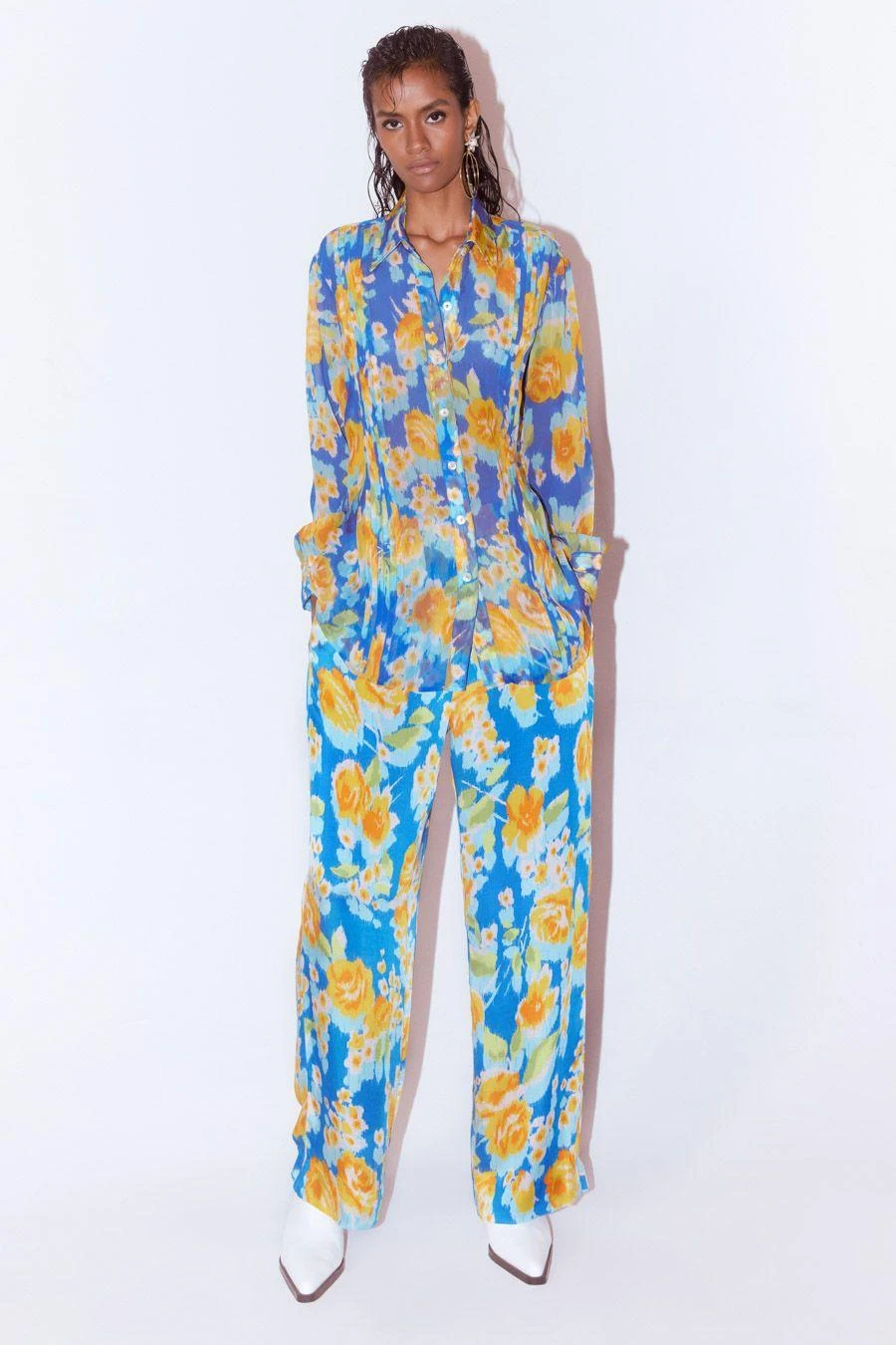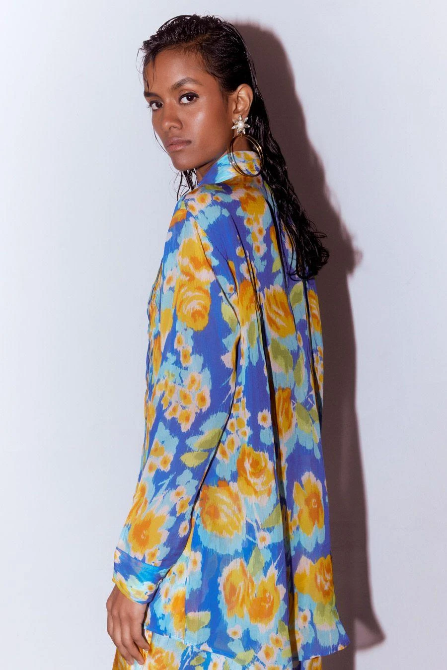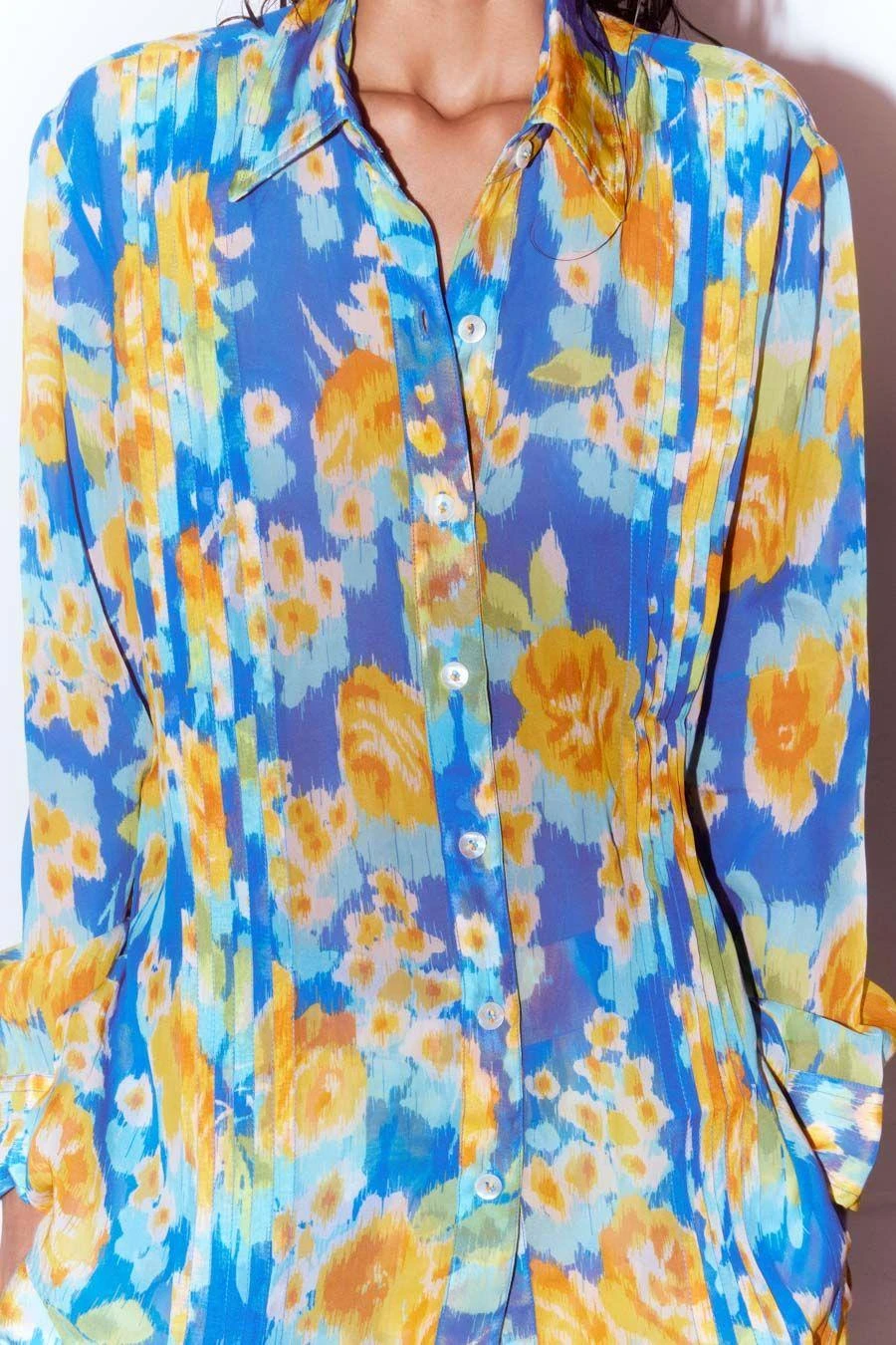 Crafted in organza, this trans-seasonal, statement piece features an abstract floral marigold print with hand embroidered beads & pintucks on each side of the yoke. This boxy and casual shirt can be paired with coordinating pants from the collection.