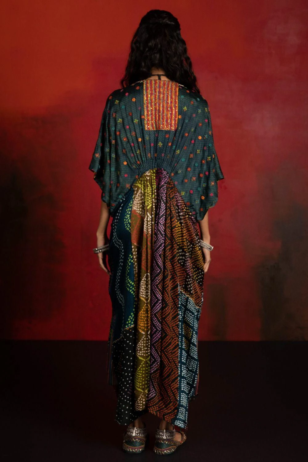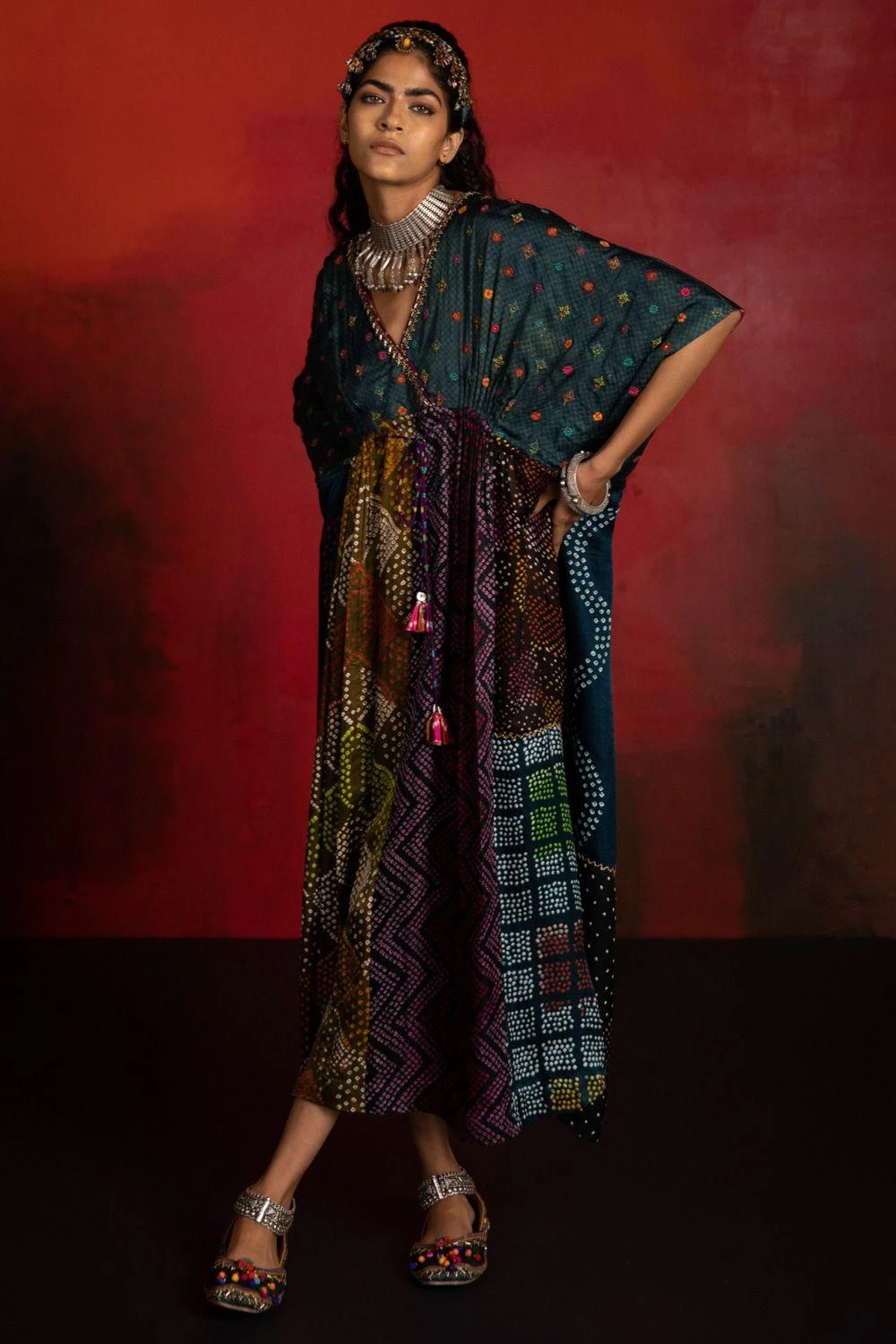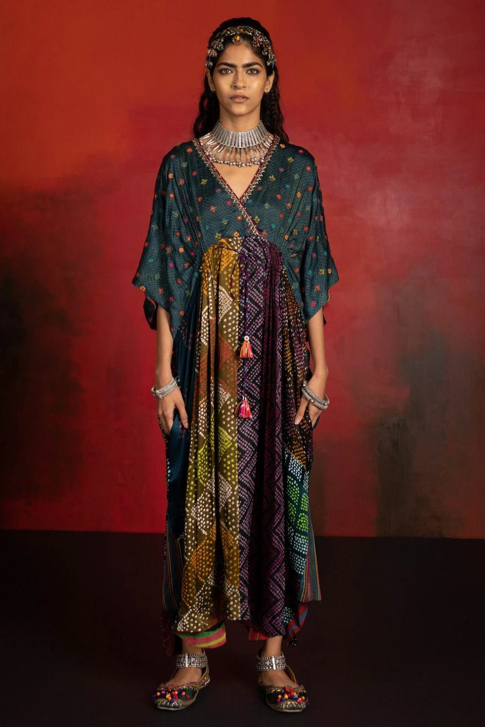 This effortless green kaftan is set in modal & gajji silk. It is hand block printed using natural dyes. The surface embellishments are inspired by traditional folk embroidery. Style this piece with statement earrings for an evening soiree.