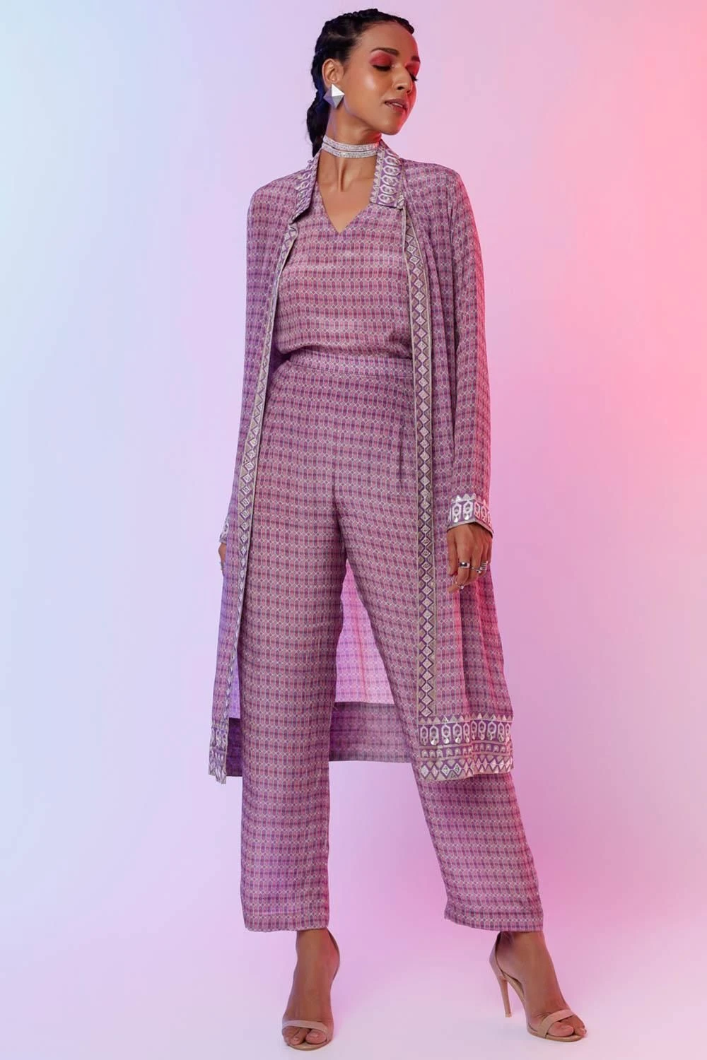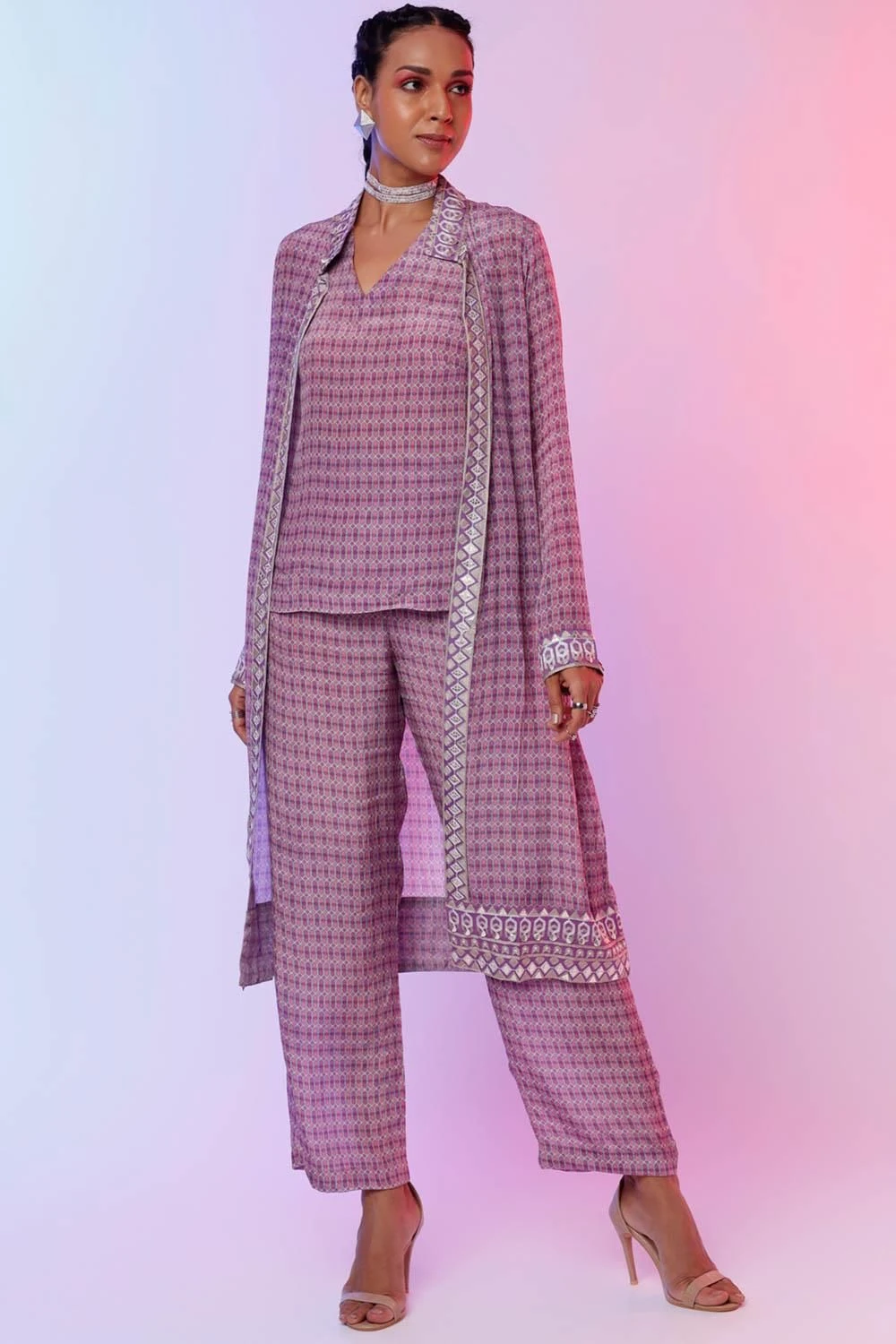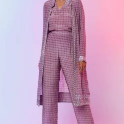 The perfect amalgamation of style & comfort, this set is a must have for your closet. This set features a lattice printed camisole paired with an embellished jacket & pants. Style this set with a pair of statement earrings to complete the look.