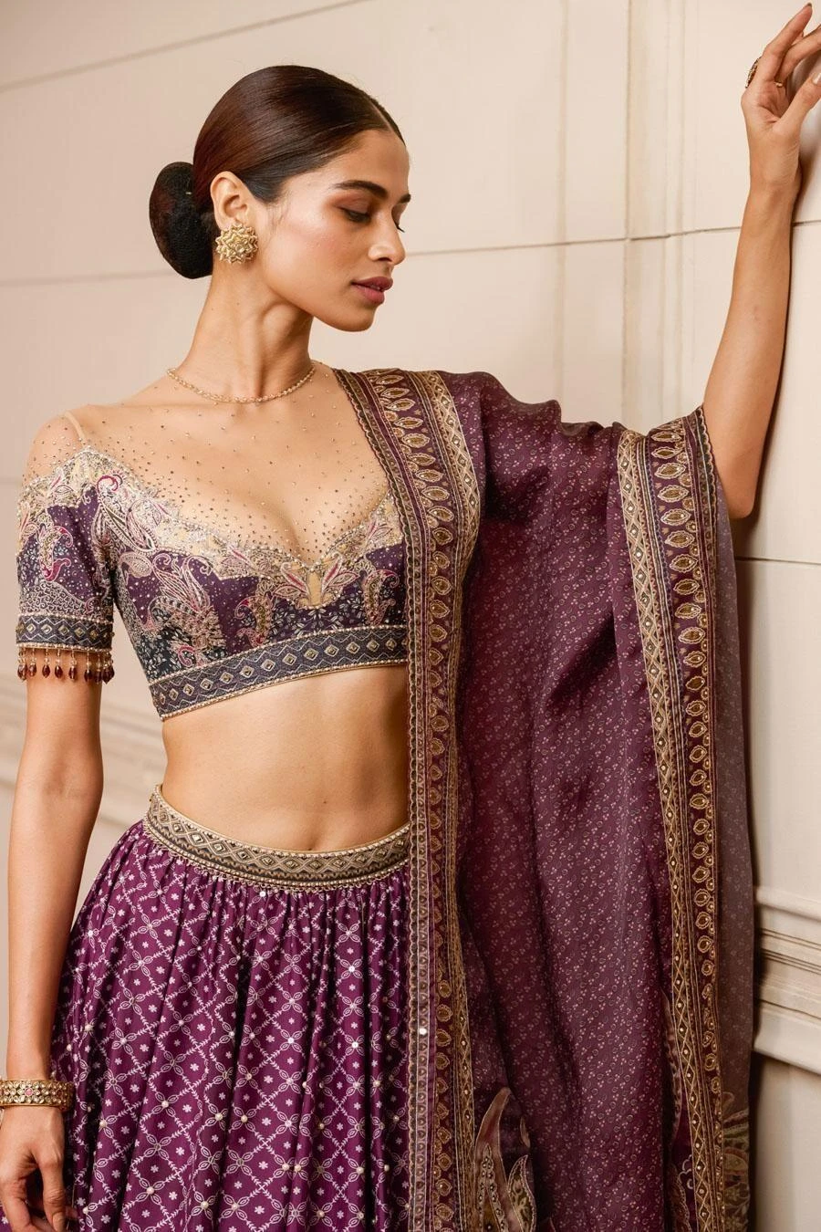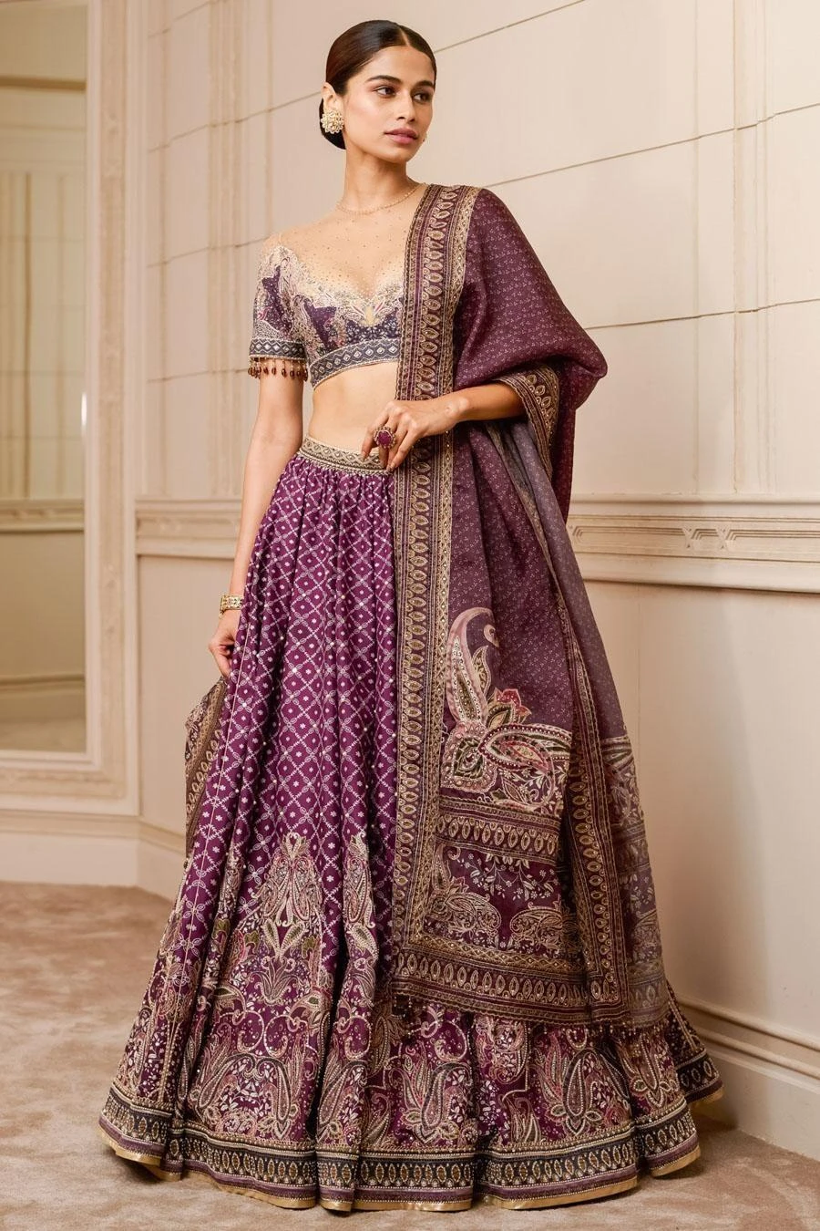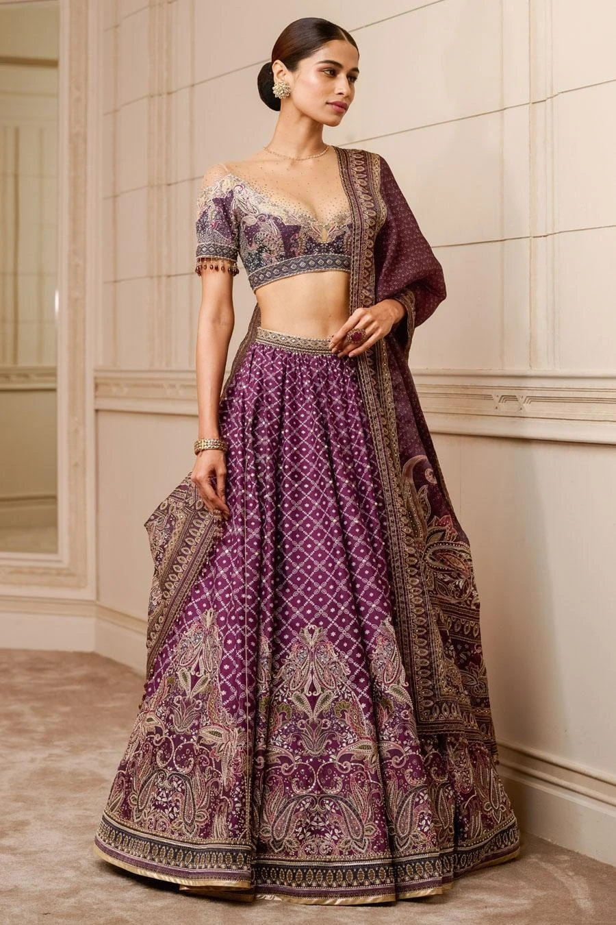This printed lehenga in Chinese dupion fabric is accentuated with zari threadwork, sequins, and dainty pearls. It is offset with a matching blouse featuring a scalloped neckline and sheer panel and an ombre dupatta.