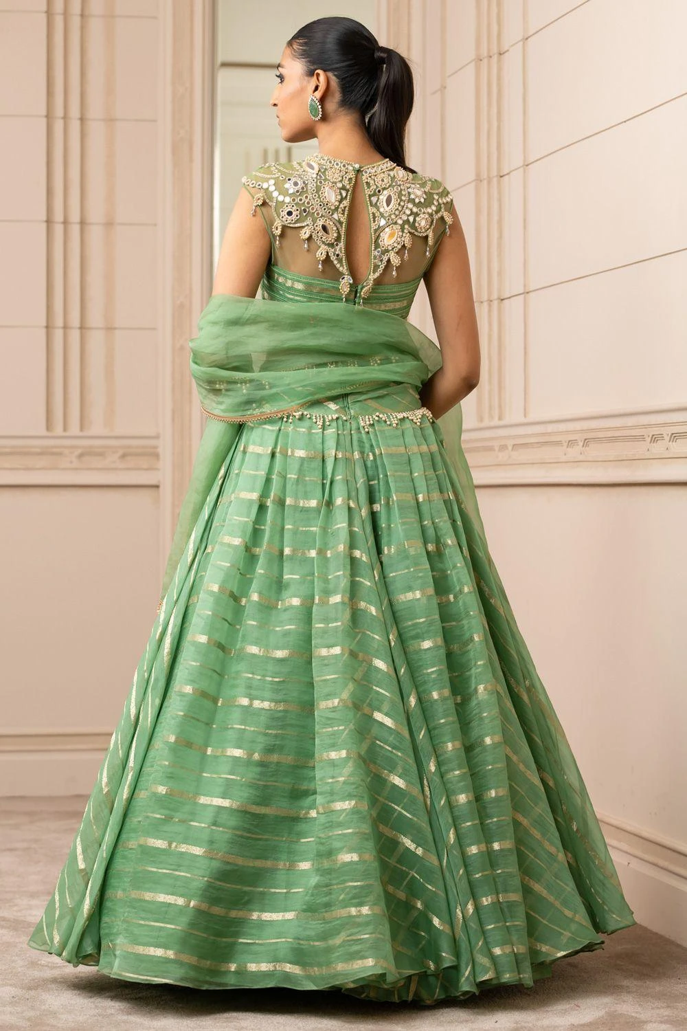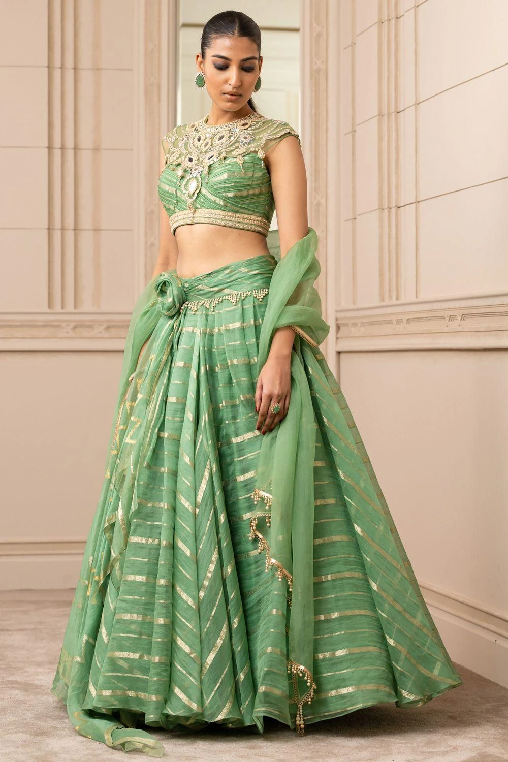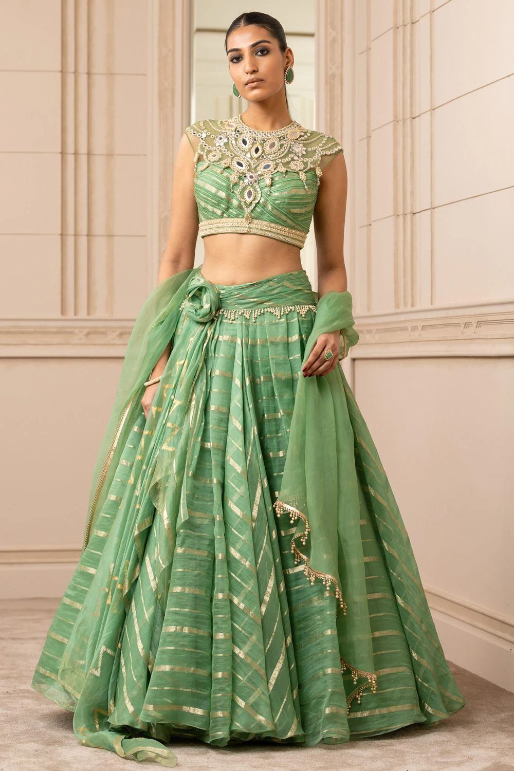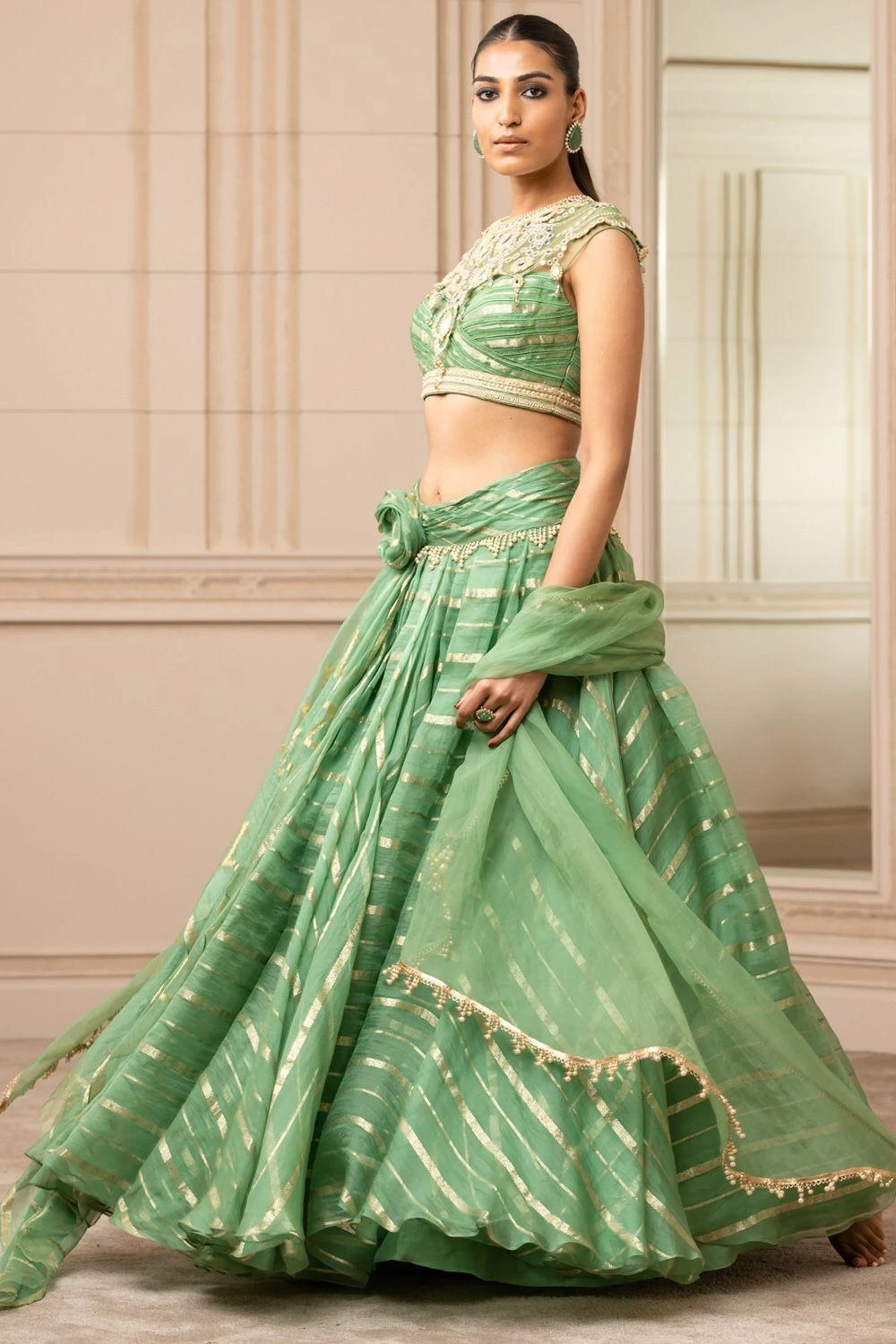 For the modern day brides, this green drape lehenga set is perfect for a stand out look. It features a brocade cascading lehenga with pearl waist, paired with a sheer neck blouse detailed with resham & mirror work and a sheer silk stole.