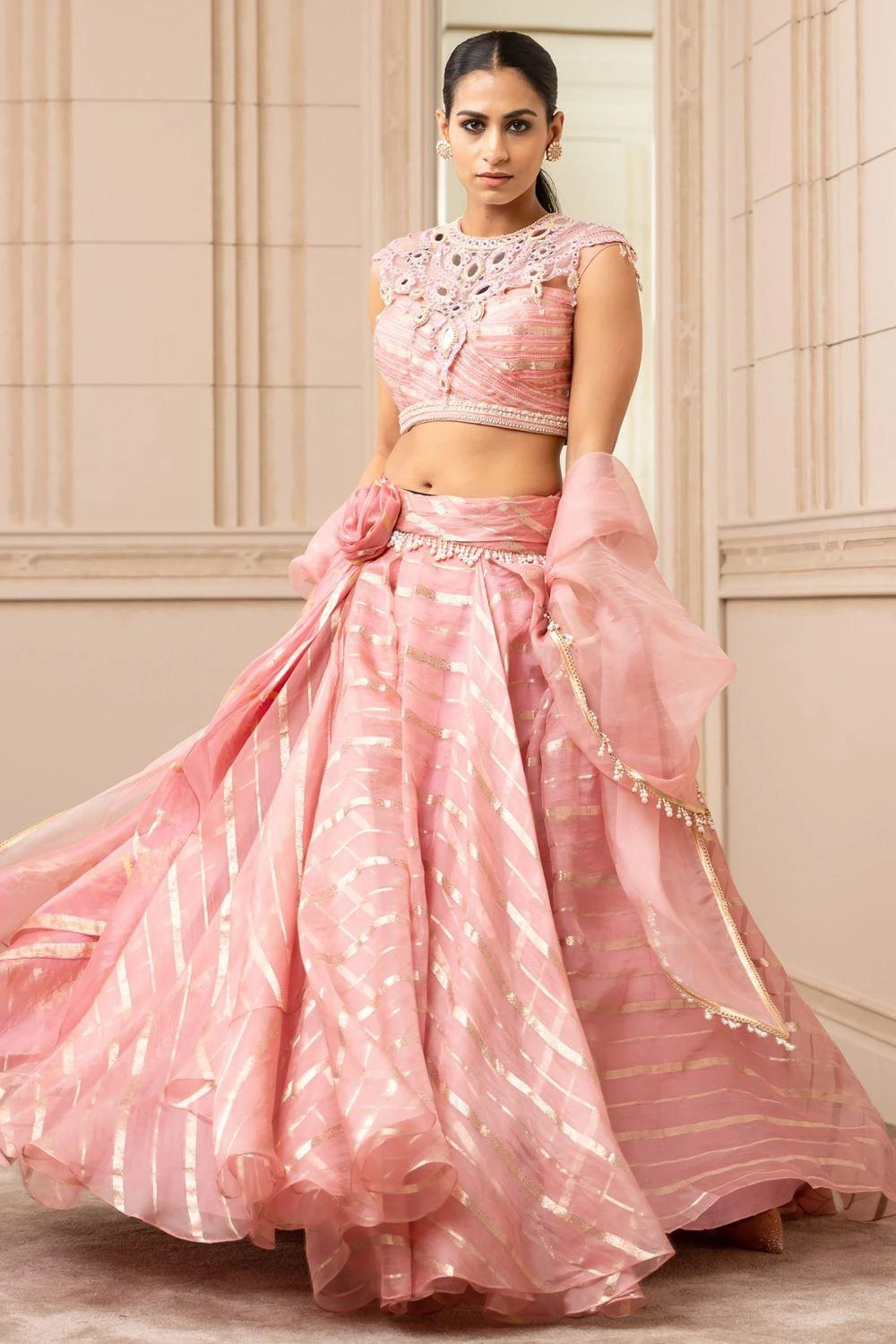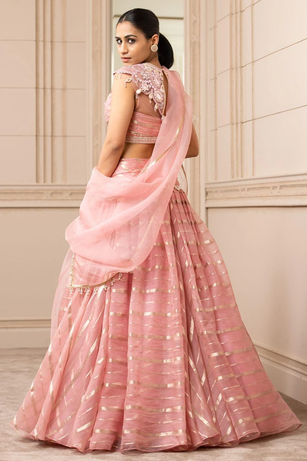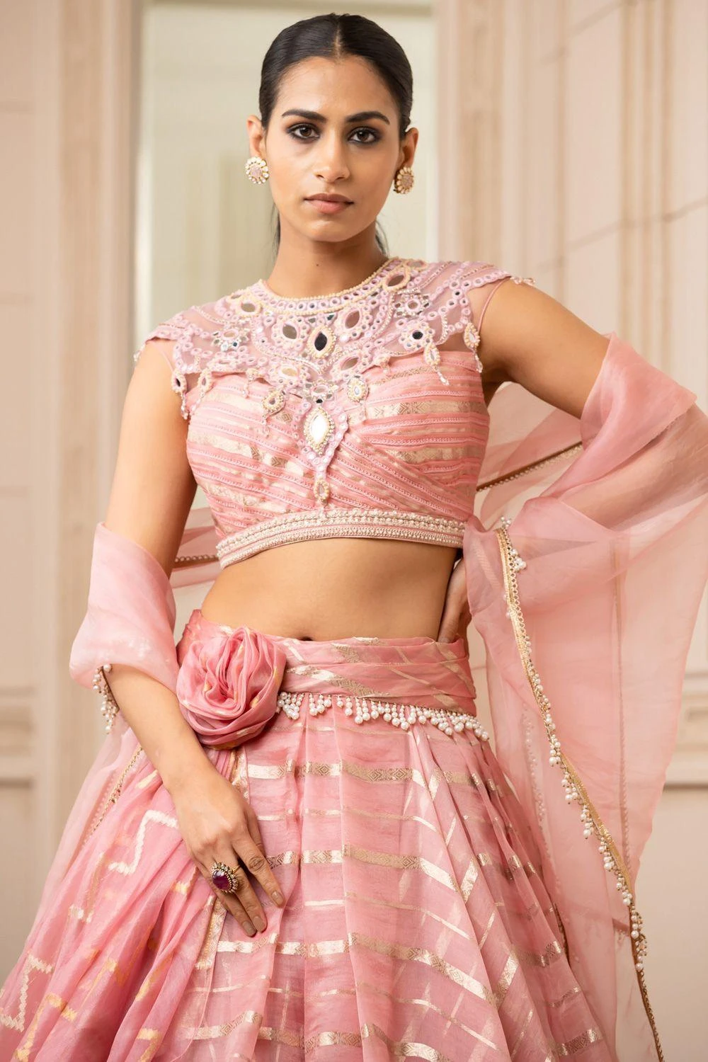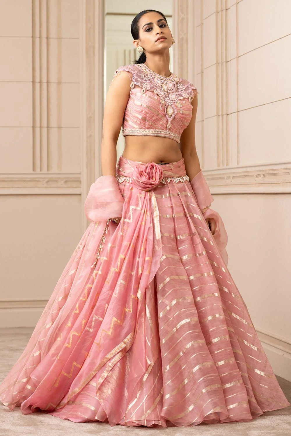 For the modern day brides, this pink drape lehenga set is perfect for a stand out look. It features a brocade cascading lehenga with pearl waist, paired with a sheer neck blouse detailed with resham & mirror work and a sheer silk stole.