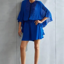 Look effortlessly stylish with this Sage green crystal embellished jumpsuit. This jumpsuit fabricated in delicate French lace is accentuated with crystals all over. It features metallic crinkle tulle wings and tie detailing in the back.