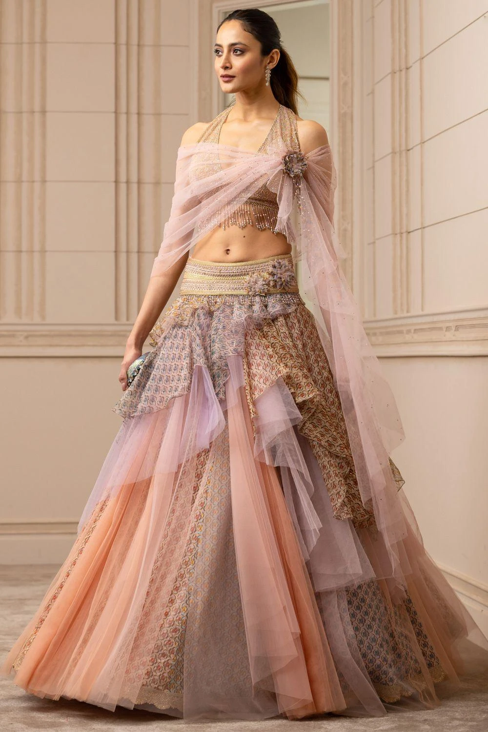 Fulfill your princessy dreams with this blush pink cascade lehenga designed in delicate tulle fabric. It is embroidered at the hip yoke & features a floral applique motif at the waist. It is beautifully paired with a studded blouse and a tulle drape.