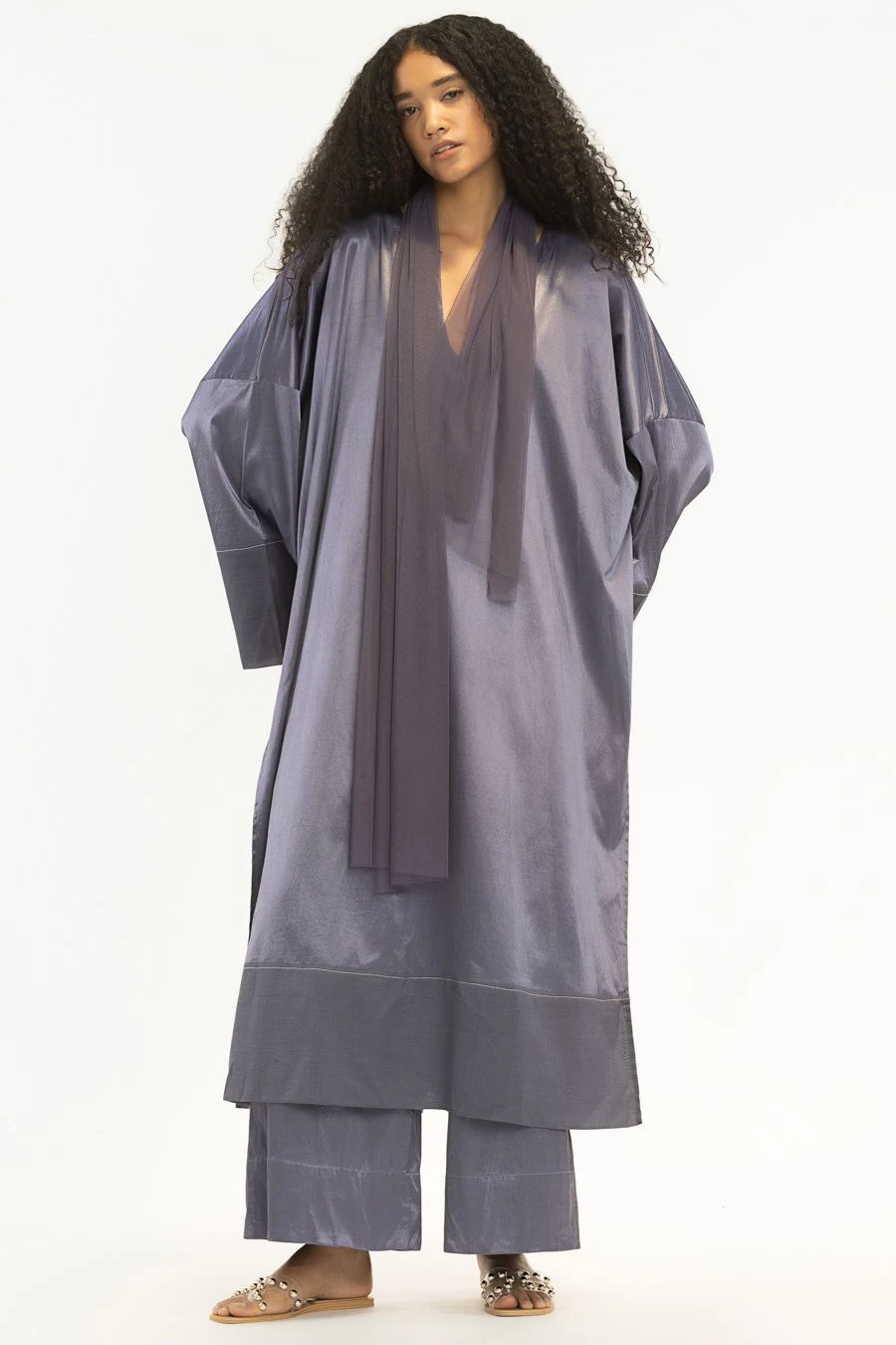 This kaftan set falls in the realm of luxe minimalism. Crafted in satin lycra, this set features a V-neck kaftan with a chanderi panel at the bottom paired with broad pants. Style this set with dainty jewellery to complete the look.