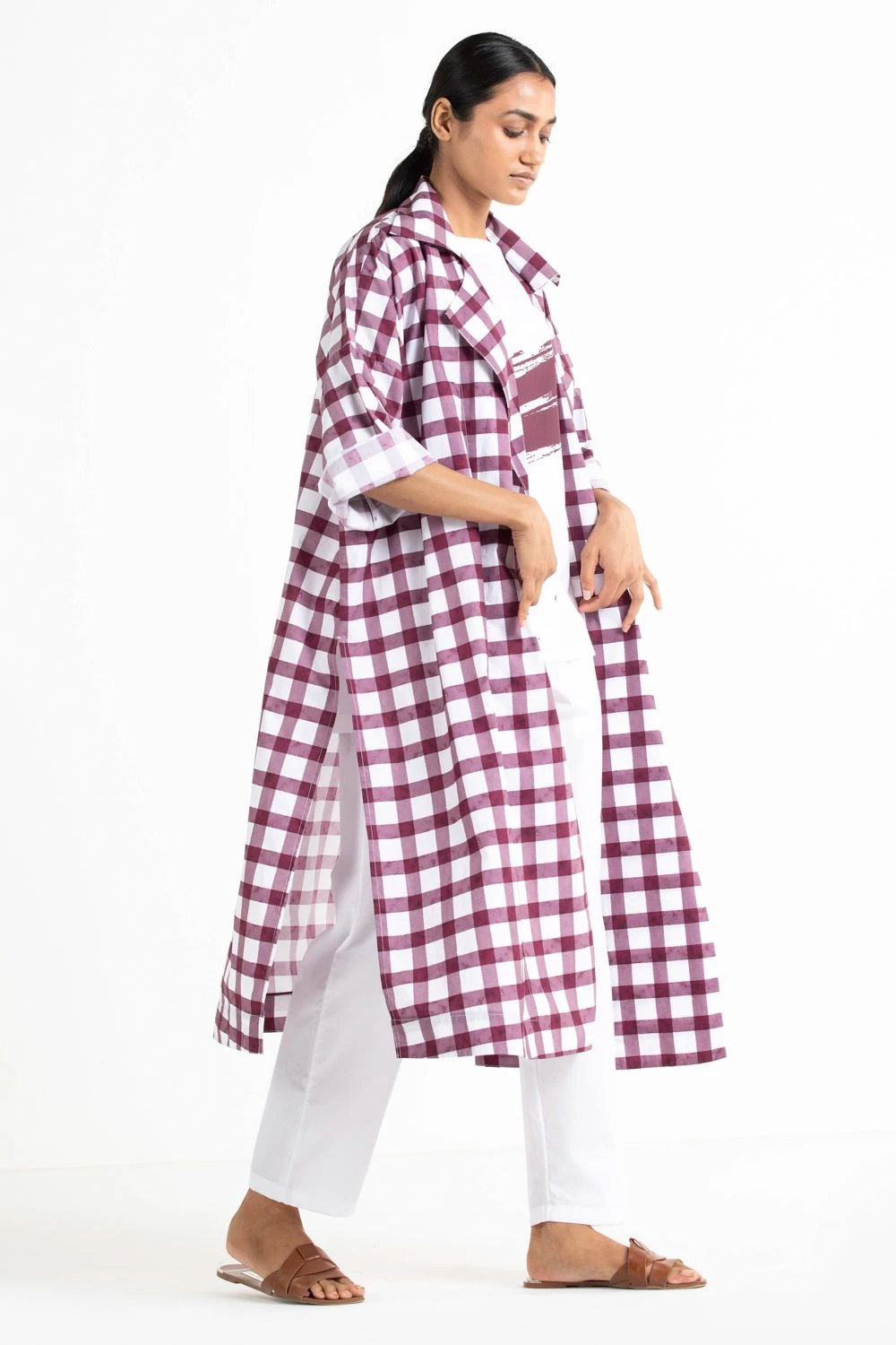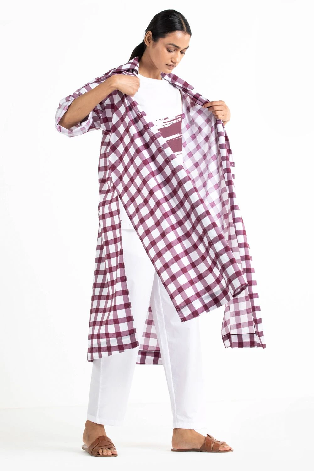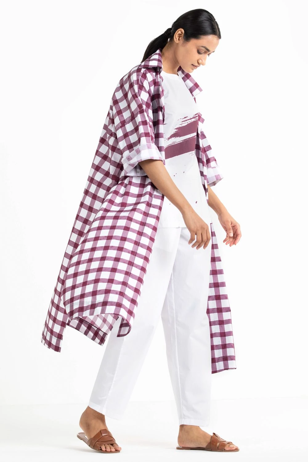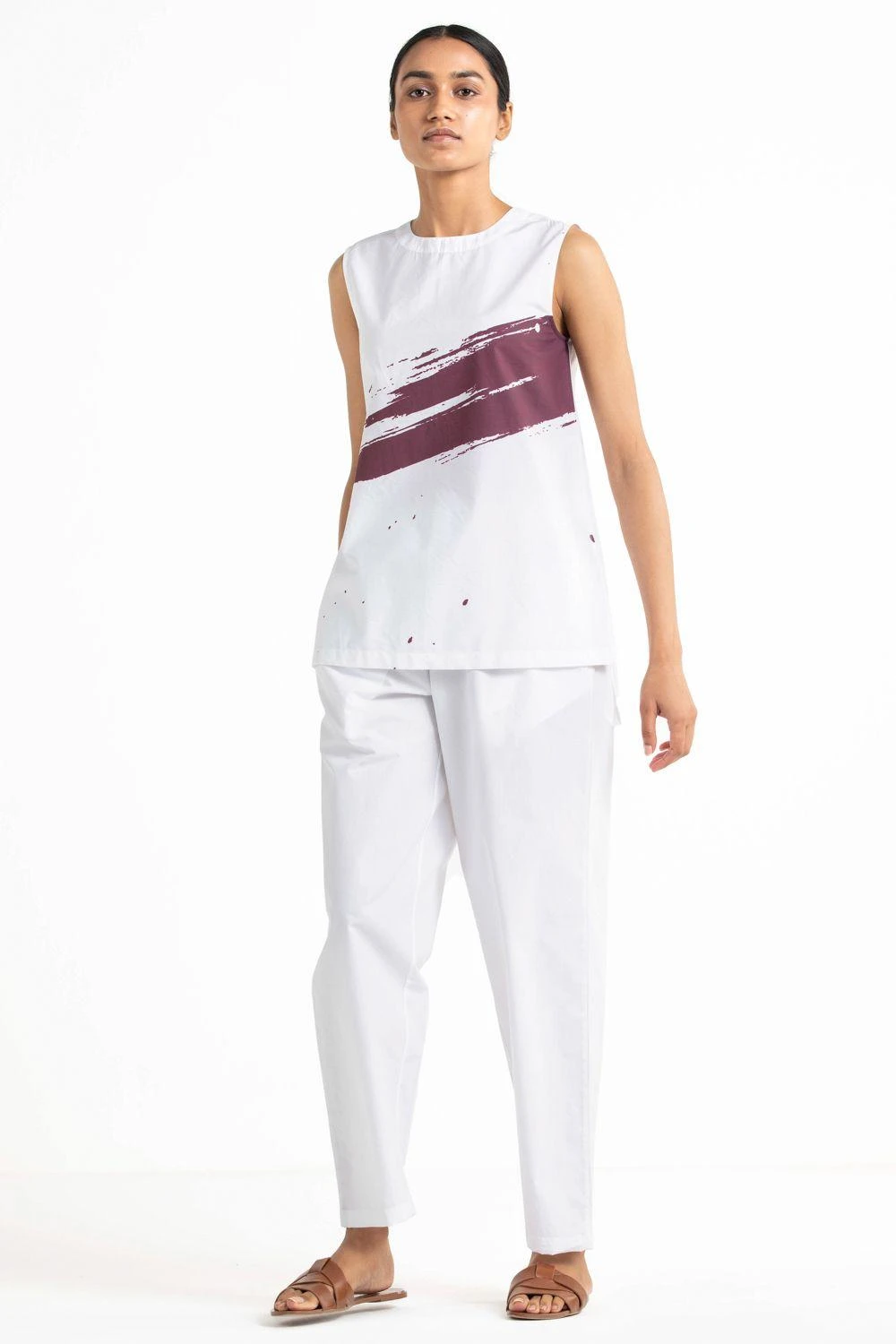 Add an artsy element to your everyday looks with this white sleeveless top. Cut in 100% cotton poplin, it features a wine abstract brush stroke print on the plain white base. Team it up with a pair of denims or cotton pants.
