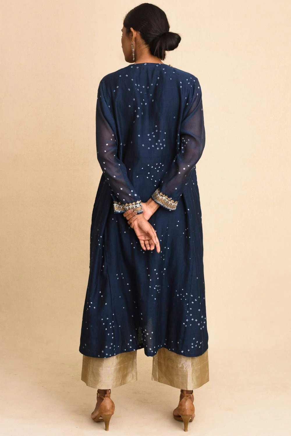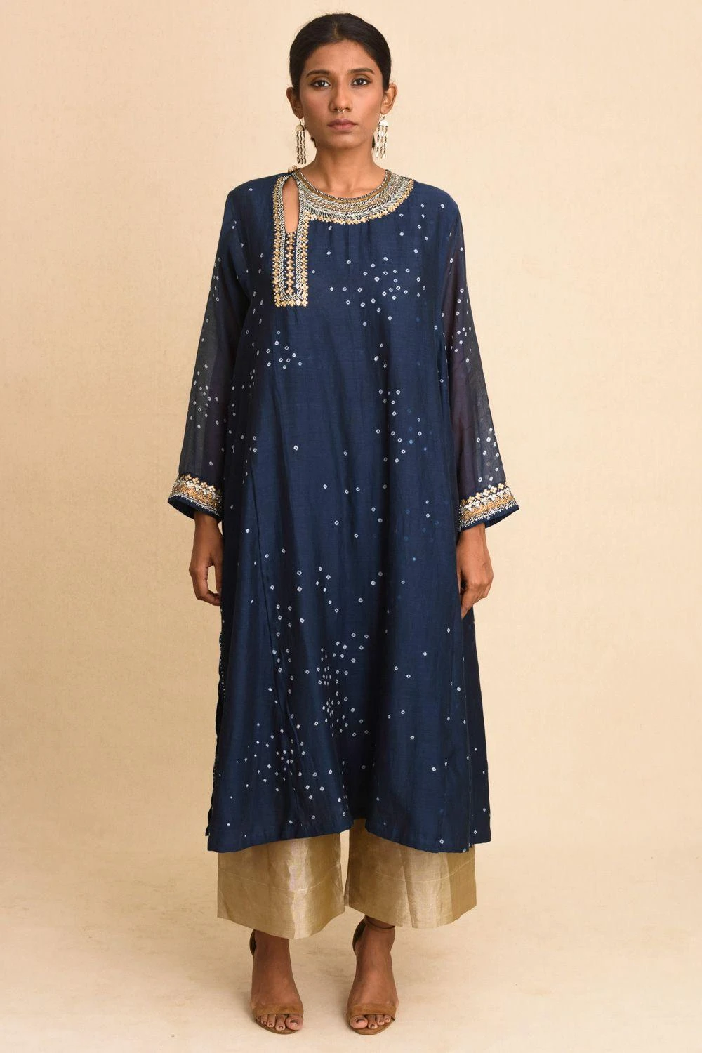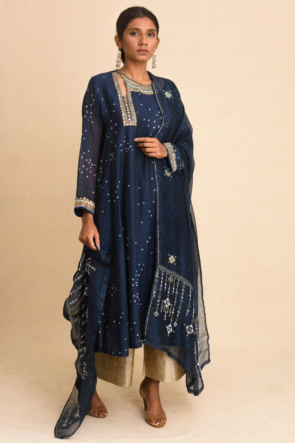 Set in luxe cotton silk, this kalidar kurta is set in an indigo blue base & enhanced with bandhani dots, aari stitches & sequin work around the neck opening. You can team it up with a pair of gold tissue pants for a sophisticated festive look.