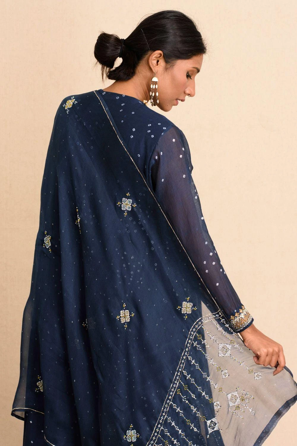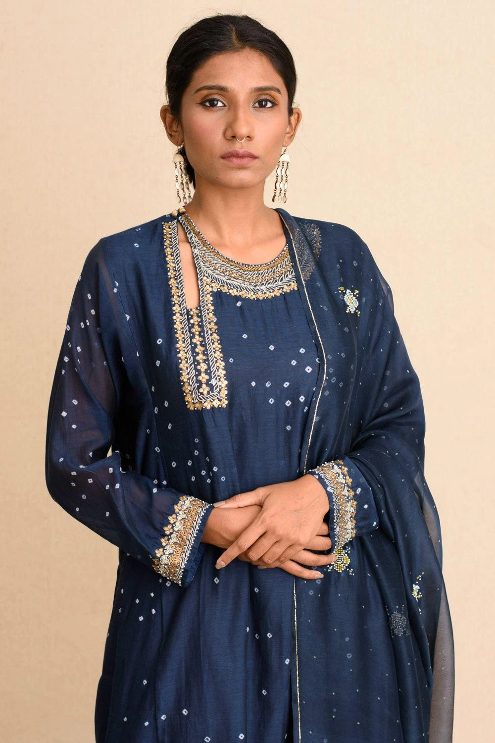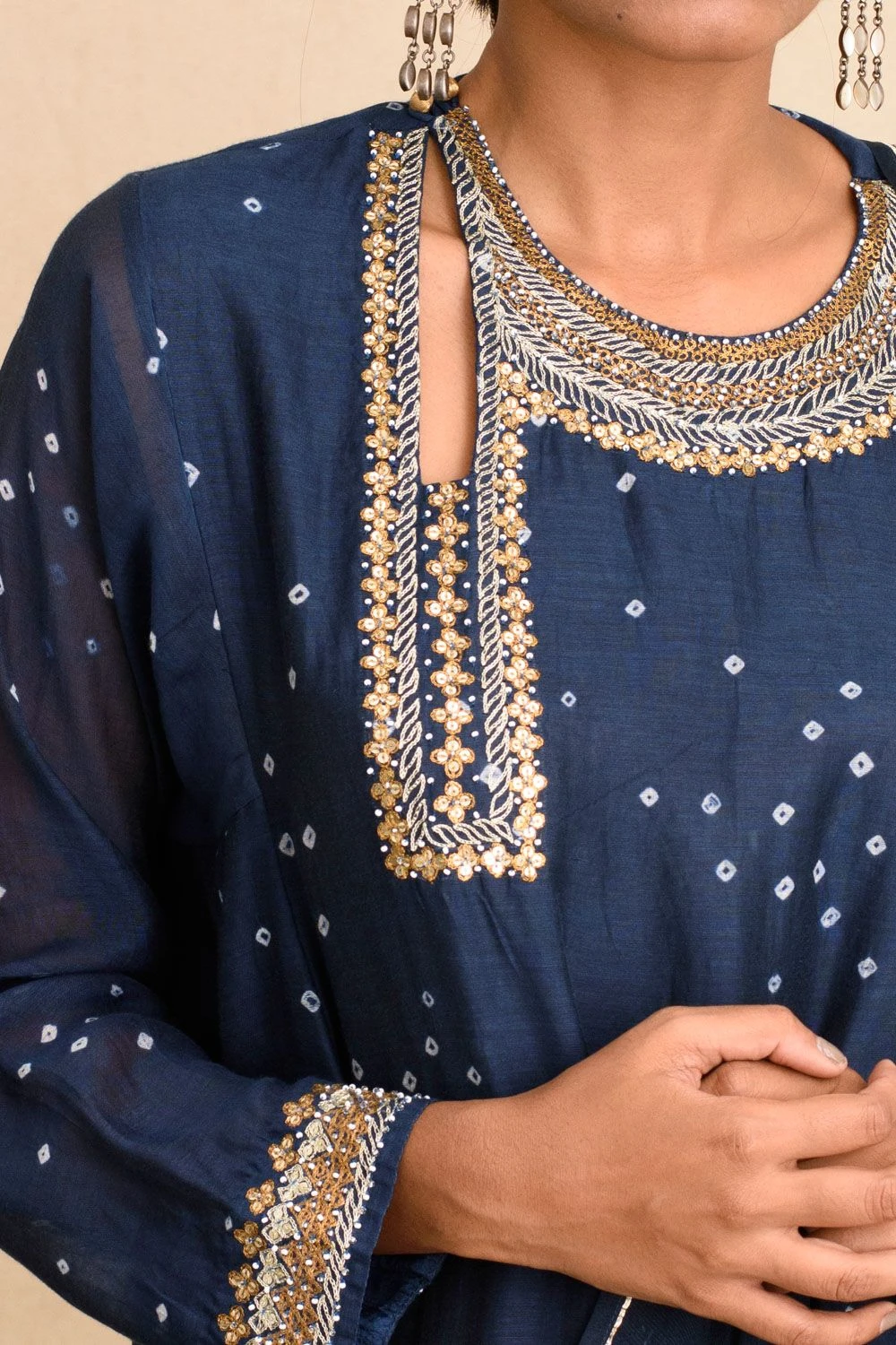 Set in luxe cotton silk, this kalidar kurta is set in an indigo blue base & enhanced with bandhani dots, aari stitches & sequin work around the neck opening. You can team it up with a pair of gold tissue pants for a sophisticated festive look.