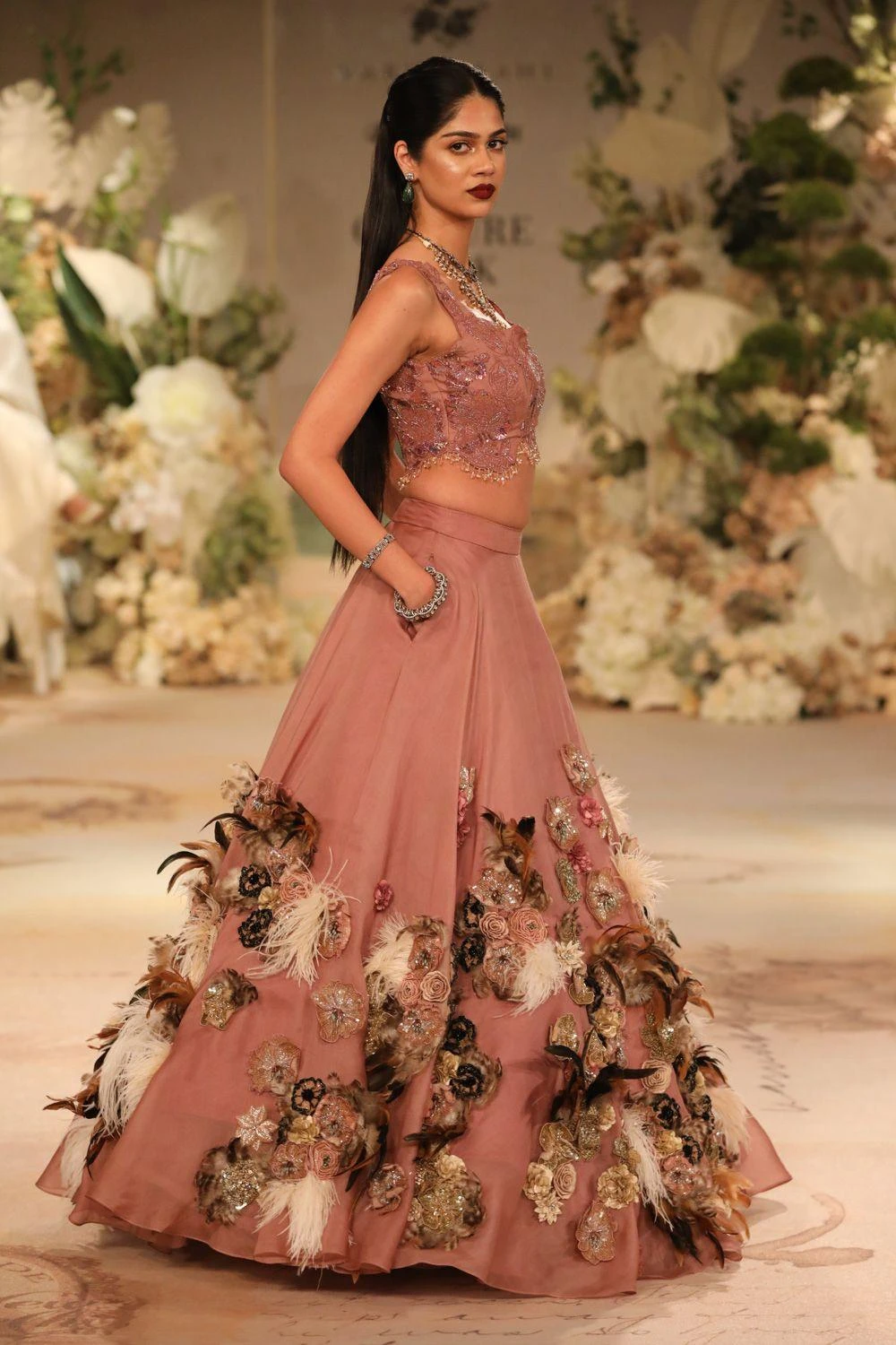 Look effortlessly stylish with this lavender pink corsage lehenga set. The lehenga boasts 3D floral corsages, stones, and delicate ostrich feathers. The blouse is intricately hand-embroidered with tonal sequins, cutdana, and sparkling crystals.